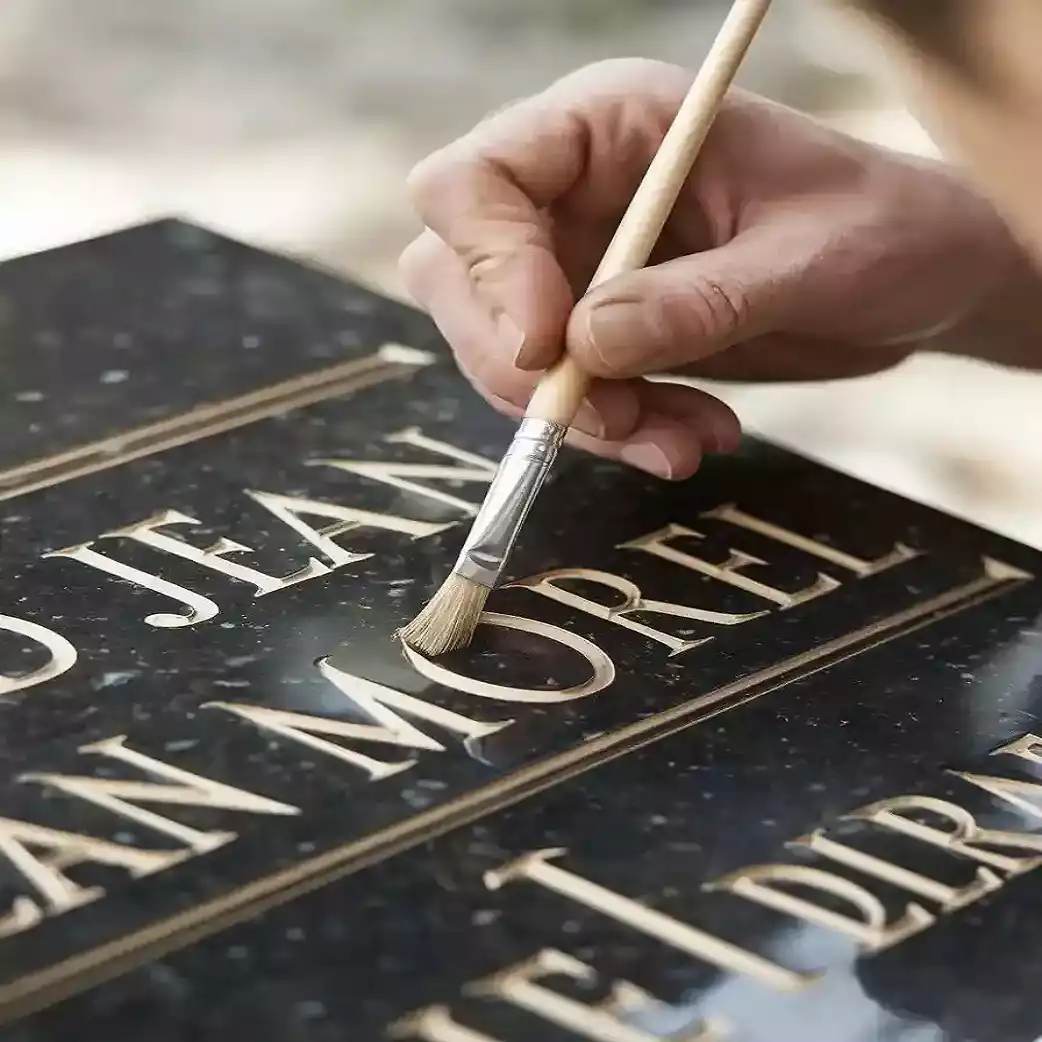 Chez Scintillance, nous nous servons de produits adaptés aux différents types de pierre (granit, marbre, calcaire) afin d’en assurer durabilité et esthétique. Dans un premier temps, le lettrage est nettoyé en profondeur, et la peinture ainsi que ces excédents sont décapés à l’aide de matériels de précision. Ensuite, une peinture à base de résine est appliquée suivant la couleur de votre choix (argenté, blanc, bronze, doré ou noir). Pour finir, la nouvelle peinture est laissée à sécher naturellement. Celle–ci ayant, en général, une longévité comprise entre 10 et 15 ans au minimum.